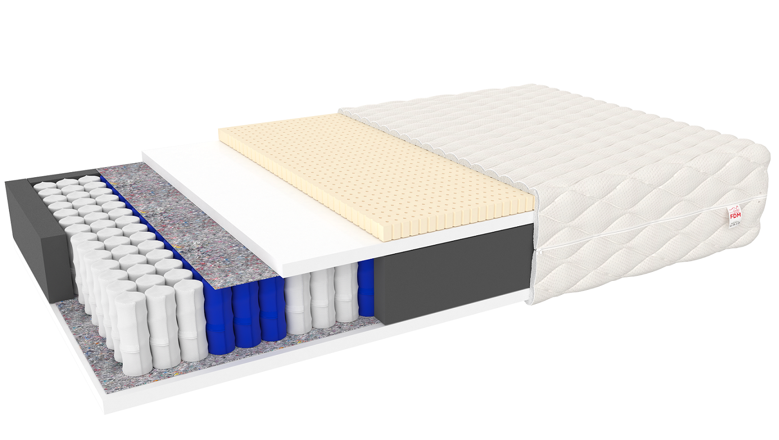Sprężyny kieszeniowe zostały otoczone pianką poliuretanową o podwyższonej twardości dla zapewnienia stabilności parametrów produktu. Zastosowany został również wkład lateksowy, który zapewnia odpowiednią cyrkulację powietrza. Dzięki czemu zapobiega nadmiernemu poceniu się podczas snu.