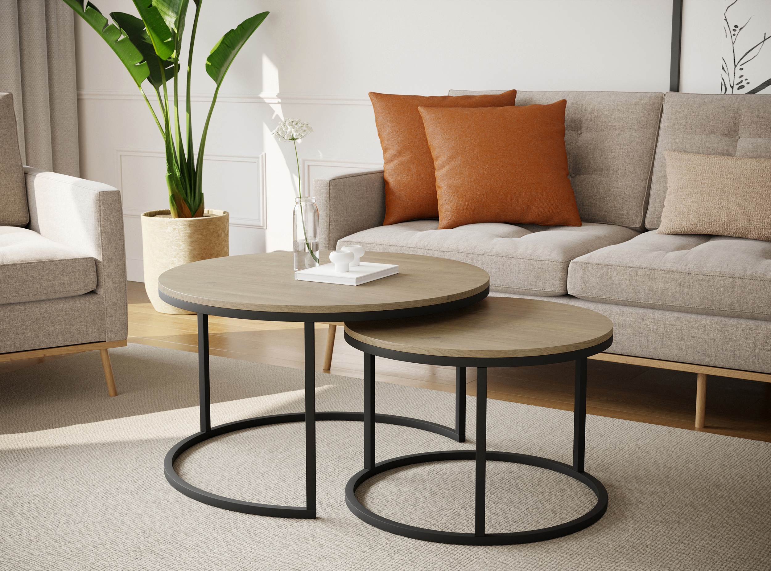 - Zestaw dwóch okrągłych stolików kawowych MJU to meble, które pięknie komponują się w każdą aranżację wnętrz. Komplet skonstruowany tak, aby jeden stolik mógł schować się pod drugi, można dowolnie ustawiać, przestawiać, wykorzystywać razem lub osobno.