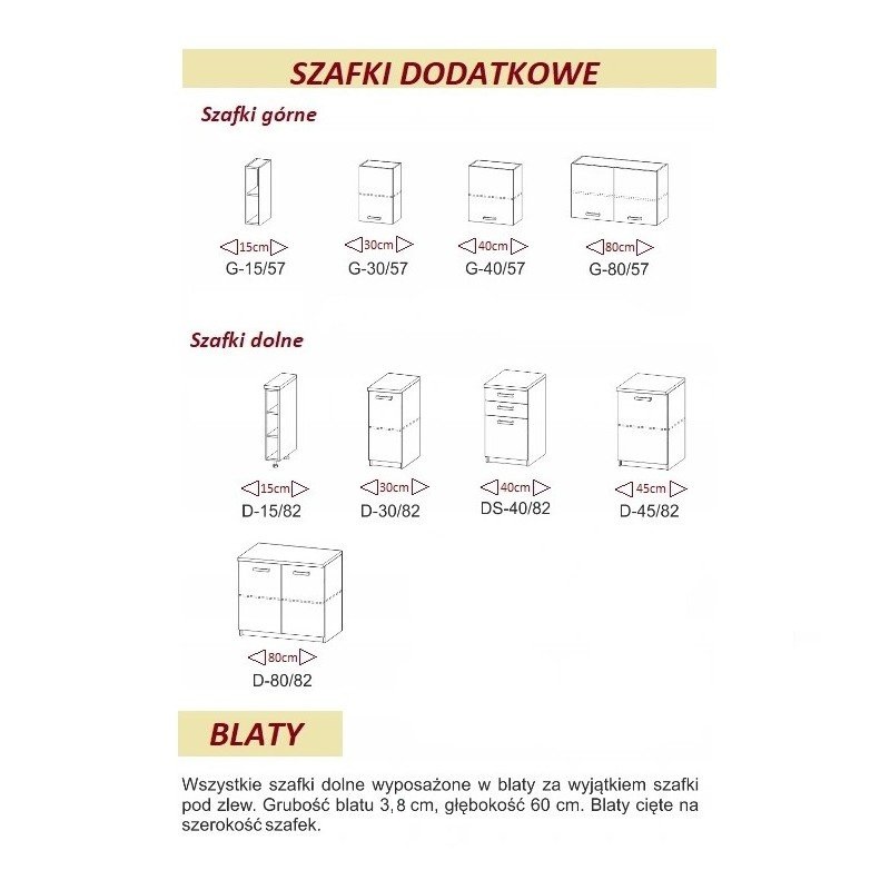 Wszystkie fronty i korpusy zostały wyprodukowane na bazie najwyższej jakości płyty meblowej. Dołączony blat roboczy o grubości 3,2 cm stanowi świetne uzupełnienie zestawu mebli do kuchni. Dzięki warstwie laminatu, którym jest pokryty, ma zwiększoną odporność na wysoką temperaturę i uszkodzenia mechaniczne.